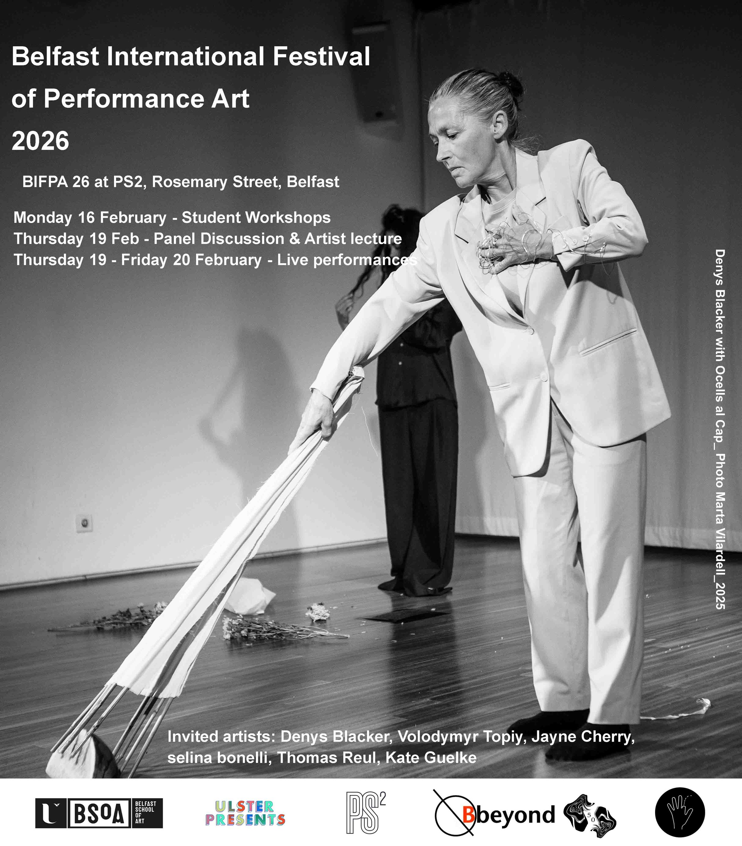 This year the BIFPA team have invited Denys Blacker, who will also be delivering the student workshop, Volodymyr Topiy, Jayne Cherry, selina bonelli and Thomas Reul, who will be giving the artist lecture in the Belfast School of Art. PS2 introduce Kate Guelke to the festival, for her first live performance art solo work.